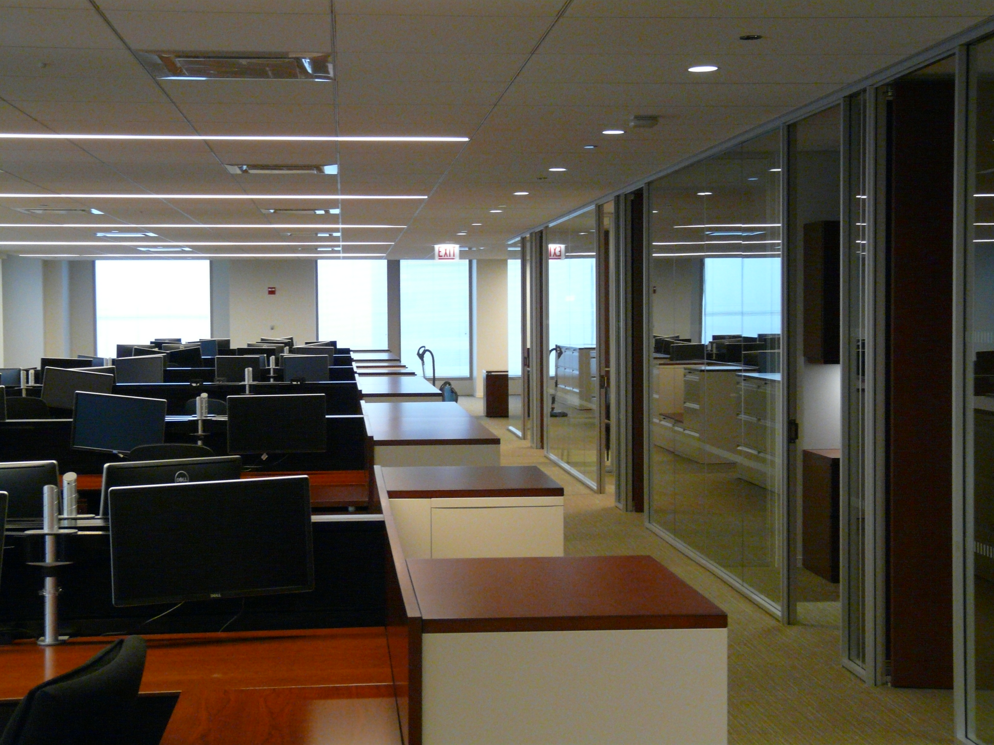 The asset management firm combined modern and traditional design in their new space. The black backpainted McGrory Glass in the reception frames a barely visible black framed flat screen tv. Teleconferencing capabilities are available in the conference room, which has a moveable/writeable wall allowing for smaller or larger groups. The demountable office paritions allow for natural light in the private offices. Dark cabinetry in the offices incorporates a more traditional feel into the modern layout.
