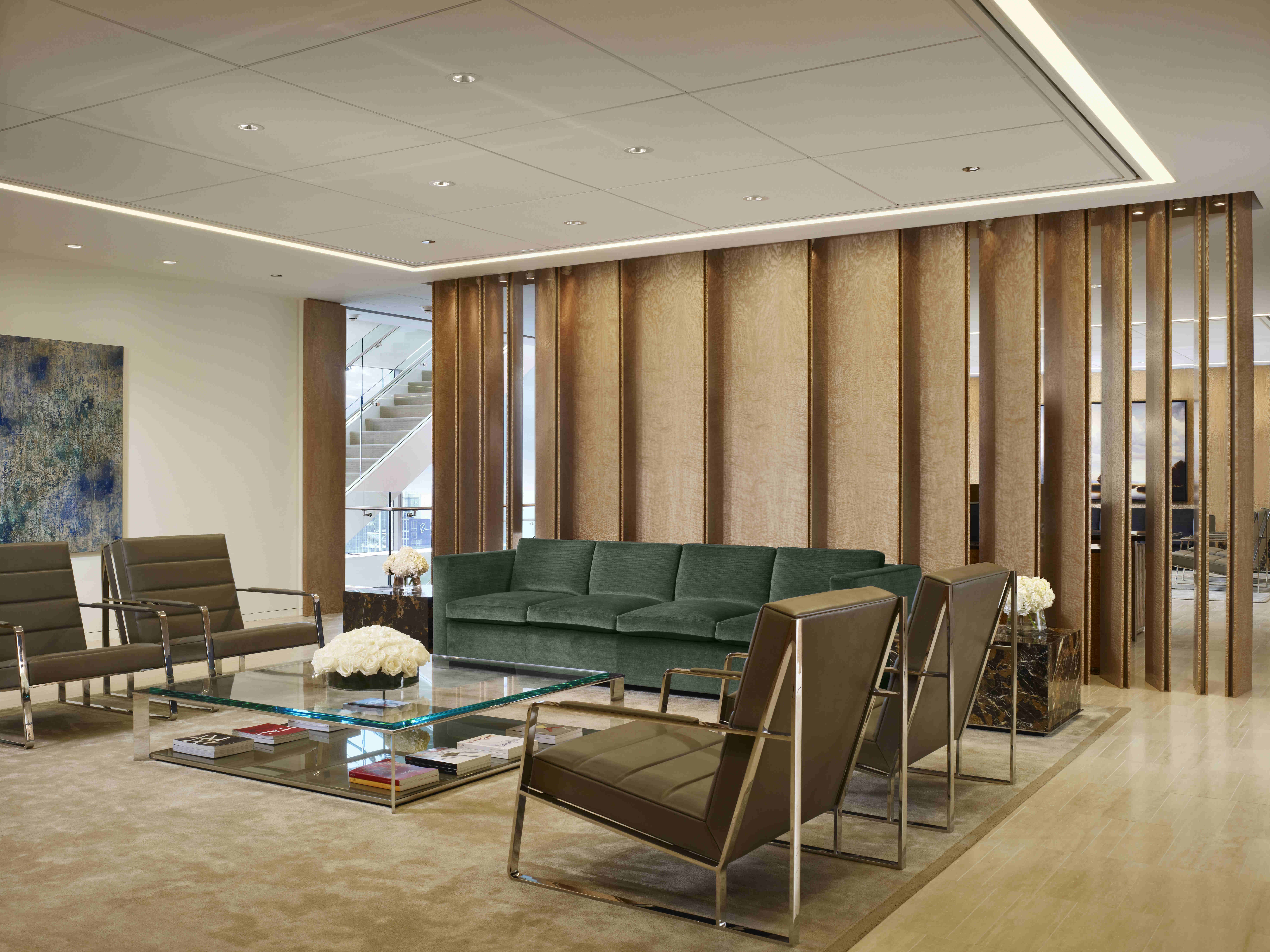 This five-floor project included construction of three huddle rooms with seating for 6-8 people and one with seating for 12 on each floor; a gaming room equipped with a projector, plasma screens, a high end audio visual system, and a beverage center. All of the huddle rooms and conference rooms have Polycom automated room schedulers, and Walltalker dry erase / projection screen wall covering. The facility also includes a video conferencing center; telepresence; wellness rooms; a training room for 20; a large conference room; and a 4,000 sq. ft. multipurpose room with ceiling mounted projectors, motorized sunshades, blackout shades, and a Skyfold Partition used to divide the room.