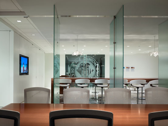 Notable project features include a bar in the reception area, a pivoting glass wall, and lacquer door surrounds.