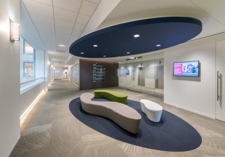 To date, ICG has completed two projects for Motorola Solutions at the iconic Santa Fe building at 224 South Michigan Avenue. Each project encompassed one full floor, totaling roughly 46,000 square feet for Motorola’s U.S. Sales Headquarters. The space is modern but blends well with the more traditional feel of the building. With a central atrium and exterior windows the new office is filled with light. The idea of light and airiness continues throughout the space; which is dominated by white walls and pops of color. The glass tile walls in the pantry combine many of the colors found throughout the rest of the space.