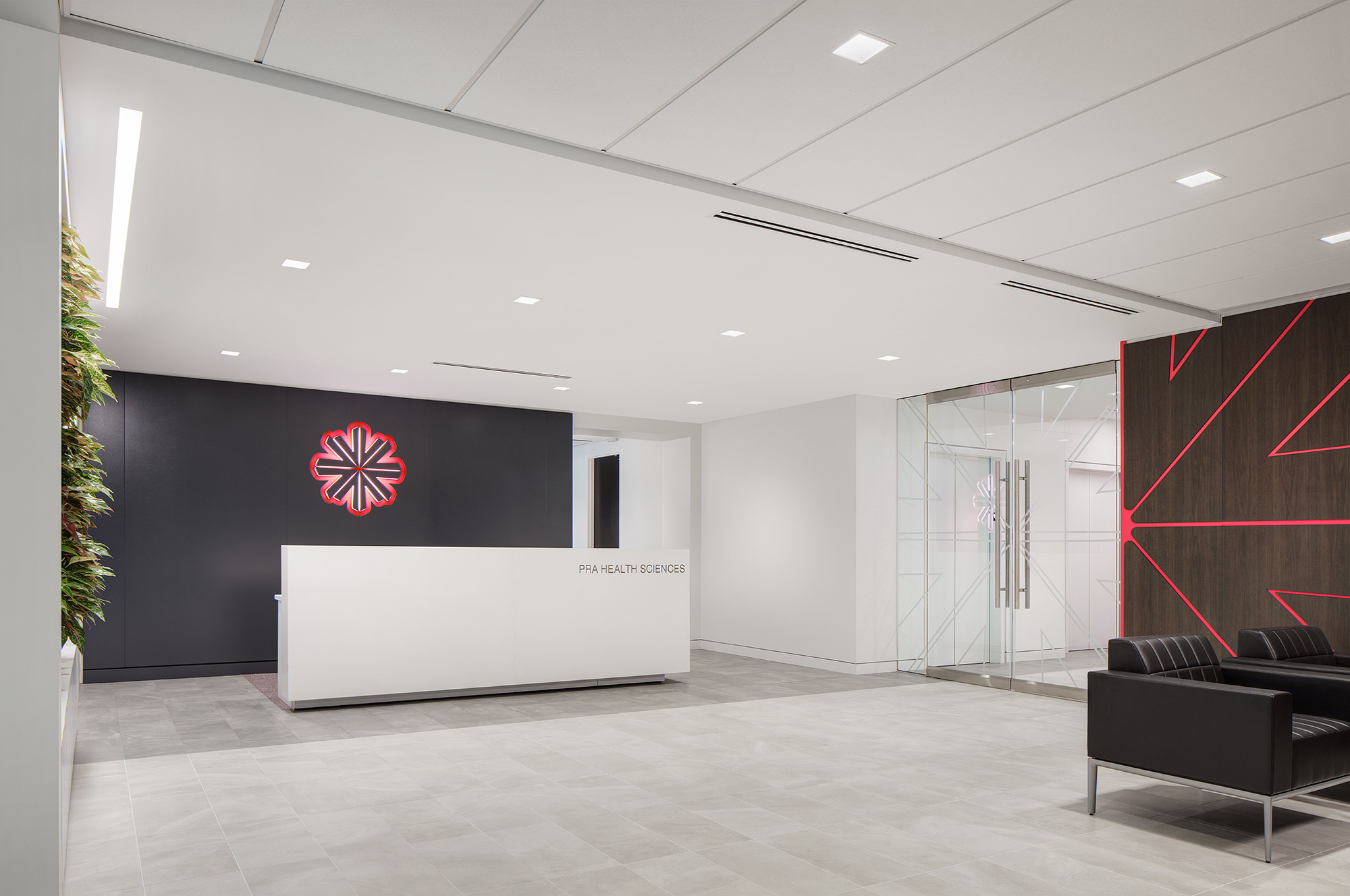 PRA Health Sciences 52,000 SF office is located in Deerfield, Illinois. Being able to accommodate a large group of people was imperative for PRA as their Deerfield location is often a meeting point for employees throughout the world. The space features multiple large conferencing centers accommodating more than 20 people each, a spacious training room, private offices around the perimeter featuring sit/stand desks and glass fronts, and over 100 work stations. What sets this space apart is the unique branding throughout. The hot pink and blue is visable throughout the office; the transparent glass decals, lighting and felt wall graphics give the space branding specific to PRA. ICG was able to provide PRA Health Sciences with a space that exceeded their expectations and truly made them and their visitors feel at home.