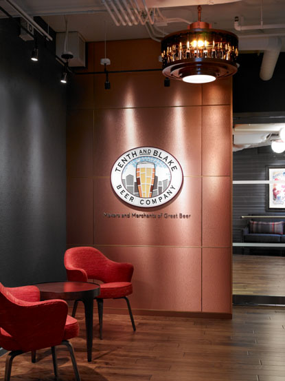 - Glass wall tile customized with randomly place bottle caps representing the many brands of beer crafted by this brewer